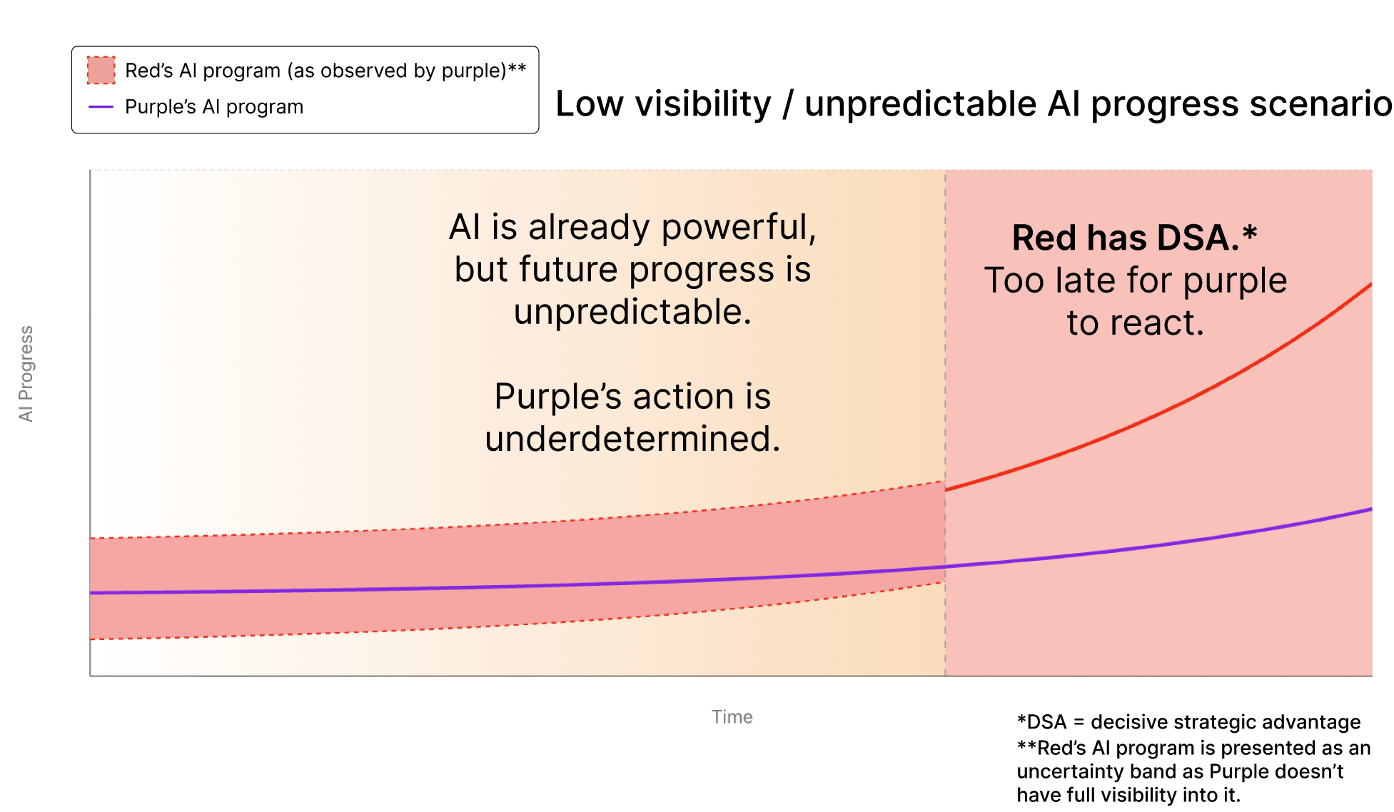 In this scenario, Red’s advantage is highly predictable to Purple. This happens as a combination of two factors: (1) AI R&D becomes highly automated relatively early in the race, making the outcome of the race more predictable as it is overwhelmingly driven by a single factor; (2) AI R&D is mostly driven by activities that cannot be concealed, such as rapid expansion of physical infrastructure like energy plants and chip foundries.