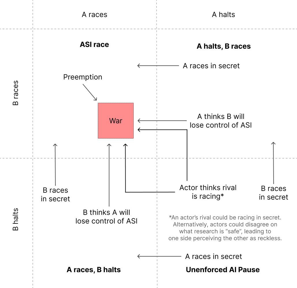 As a result, if international coordination mechanisms capable of preventing the development of dangerous AI capabilities are not established, superpowers are likely to engage in a race to artificial superintelligence (ASI), attempting to be the first to develop AI sufficiently advanced to offer them a decisive strategic advantage over all other actors.