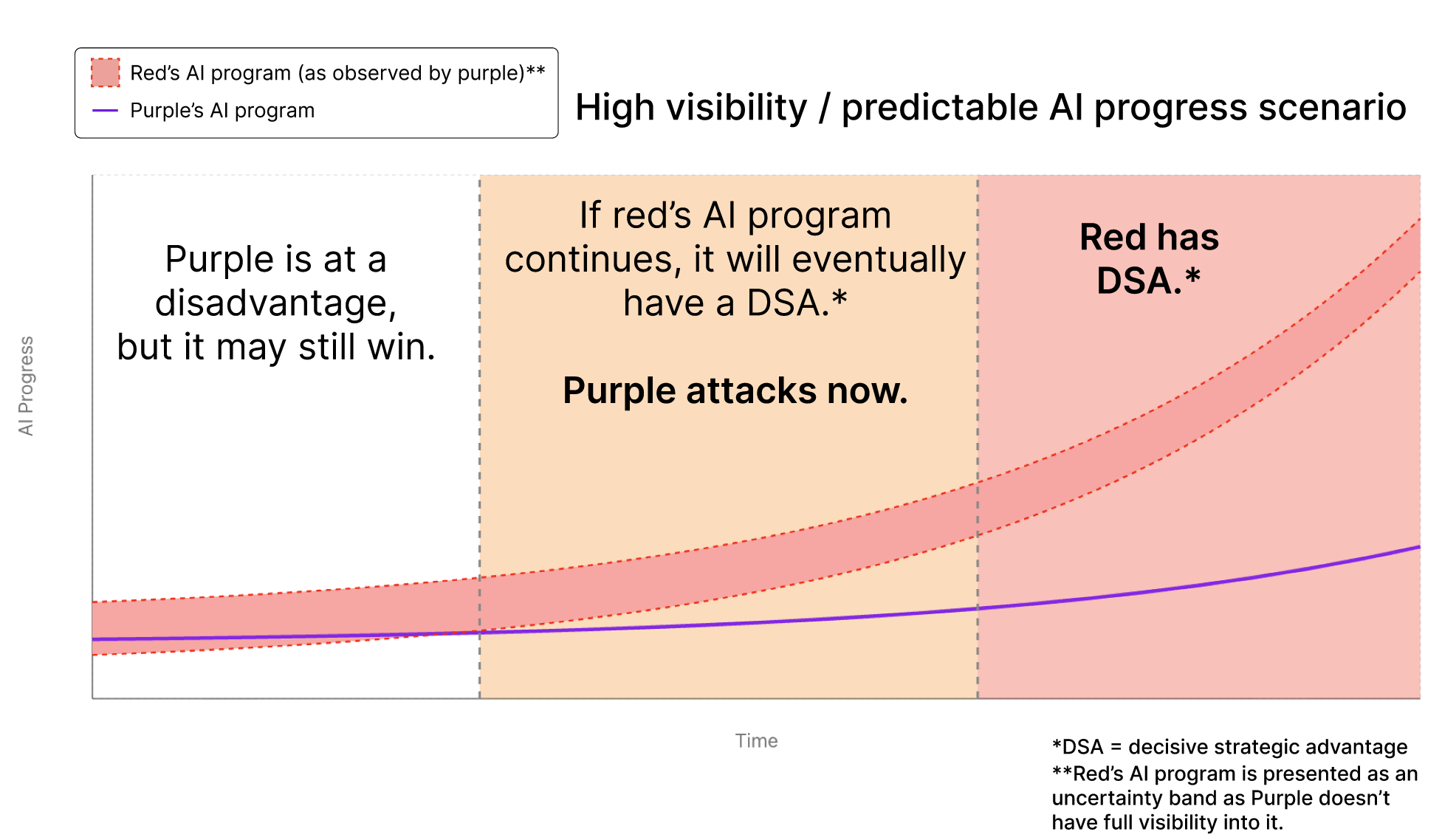 At some point, before Red has an overwhelming advantage, it becomes clear to Purple that Red will eventually develop DSA-granting AI if it is allowed to continue. At this point, Purple strikes preemptively at Red. At such a late stage, Purple must attack with enough force to disrupt or deter the AI program; this likely escalates into an all-out war between superpowers.